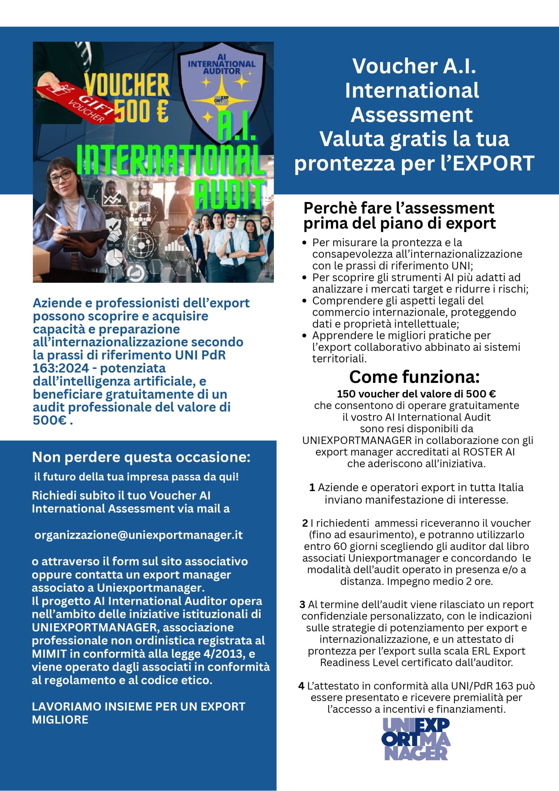 Vuoi espandere la tua azienda sui mercati esteri ma non sai da dove iniziare? Il Voucher AI International Assessment è un’opportunità esclusiva per ricevere gratuitamente un audit professionale del valore di €500,00 che verifica le capacità e la preparazione all’internazionalizzazione secondo il nuovo standard ufficiale UNI PdR 163:2024.